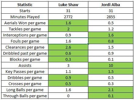 Verdict: Luke Shaw emerges ahead in stats especially in defensive duties, with better numbers in terms of aerials won, tackles, clearances blocks and occasions where he was dribbled past per game. As expected, Jordi Alba is the bigger threat going forward, contributing a stunning 10 assists this season. He also leads Shaw in terms of key passes, long balls and through balls per game.