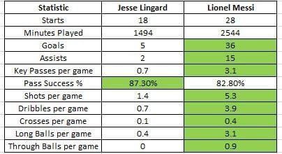Verdict: Shocker. Messi blows Lingard (and anybody else to be honest) out of the water. As expected, the statistical comparison is extremely one-sided.