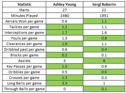 Verdict: Sergi Roberto emerges out as a clear winner given the versatility he brings to Barcelona. Young dominates in the attacking third, having delivered more key passes, crosses and long balls per game. Roberto, however, has had better end product with 6 assists compared to Young's 3-owing to Barcelona's world-class link-up play. His attacking stats like key passes, crosses and long balls have been tempered owing to Messi playing a deep role in the same flank in most matches.