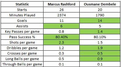 Verdict: The two 21-year-olds both have a great future ahead of them, but it is Dembele that leads in statistical terms. Dembele has better numbers in terms of goals scored as well as dribbles, crosses and crosses per game. Rashford scores above him in terms of assists, shots per game and pass success %