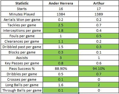 Verdict: Arthur has better numbers in pass success % and dribbles per game as well as long balls. He trumps Herrara in his vision, passing and control of the ball.