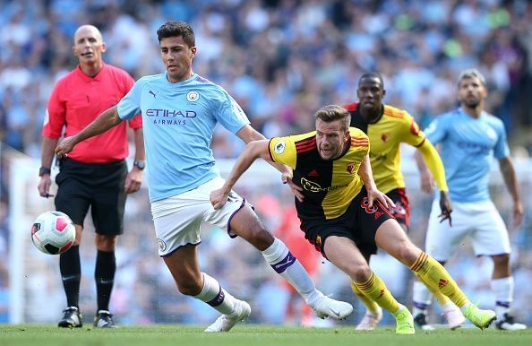 Rodrigo had his task cut out on the day because the City defence had a major injury issue to deal with. John Stones had picked up a muscle injury and was out for a month. In midweek, Pep Guardiola had opted to use Fernandinho as Nicolas Otamendi’s partner in the heart of the City defence and the Spaniard continued with the same centre back pairing against Watford. This meant that Rodrigo had to be vigil and provide extra cover to his backline. And the Spaniard did that very well.