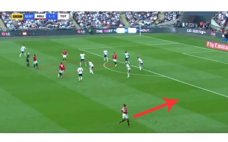 From there, the United fullback can attempt a shot himself or try to find one of the four who has found space in between the panicking Tottenham defenders.This exact situation was replicated during Herrera's winner.