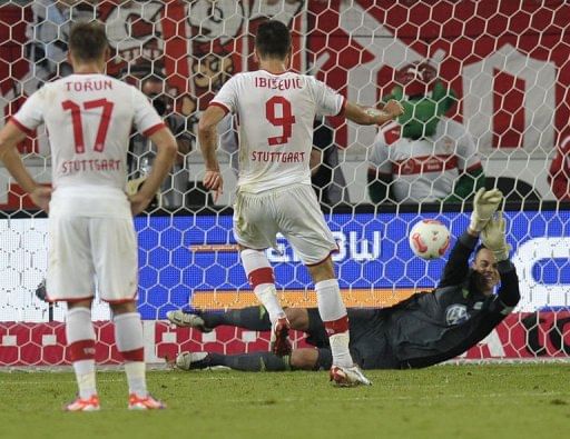 Wolfsburg’s Swiss goalkeeper Diego Benaglio (R) saves a penalty shot of Stuttgart’s Bosnian-Herzegovinian forward Vedad Ibisevic (C) during their German first division match on August 25, 2012. Bayern Munich host VfB Stuttgart in their opening home league game of the season on Sunday
