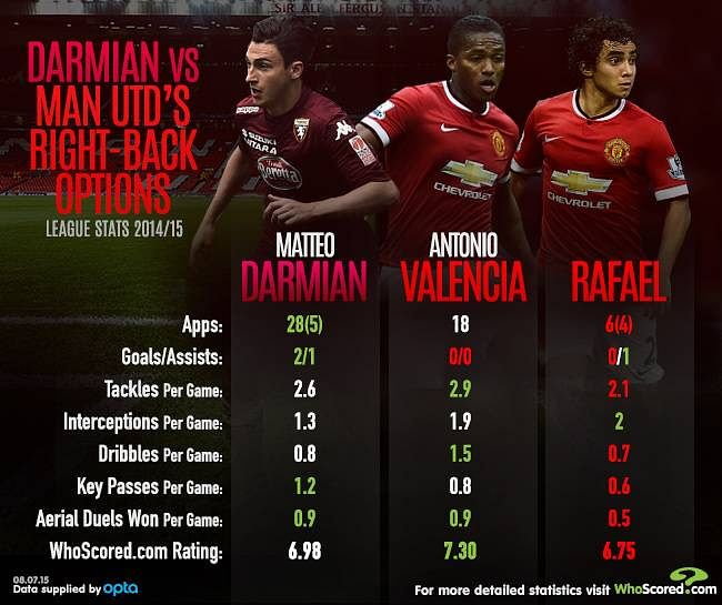 Louis van Gaal clearly had no faith in Rafael, who made just 11 appearances last season, and, well though Antonio Valencia did replacing him - by his WhoScored rating (7.23) he was United’s joint sixth best player last season - he is no specialist. In that regard, the news this week that United are poised to sign Matteo Darmian is no great surprise. United were in desperate need of a player on the right who can give them a measure of tactical control.
