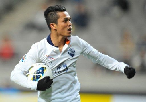 Buriram United player Ekkachai Samre celebrates after scoring against South Korea’s FC Seoul during their AFC Champions League match in Seoul on May 1, 2013. Buriram United made history as the first Thai team to reach the last 16 after a thrilling night’s action.