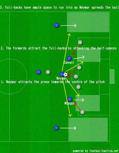 PSG builds the attack from the keeper as the midfielders, who receive the ball from the centre-backs, try to dribble or create one-twos to surge forward through the middle. The ball would later land at the forwards like Neymar or Mbappe who would attract the rival press to the middle of the pitch thereby leaving space on the wings to run into. A lay-off pass into the path of the onrushing wing players would lead to a dangerous cross with the likes of Cavani and Mbappe ready to feed upon.