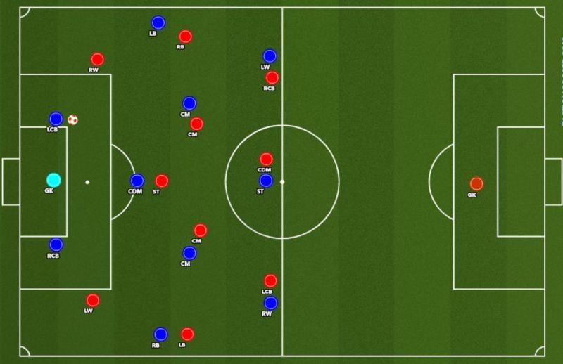 In Figure 1, the blue icons represent the team building-up from the back, while the red icons represent the pressing team. The goalkeeper of the build-up team is in light blue. You can see the centre-backs of the blue team dropping back on either side of the penalty area.