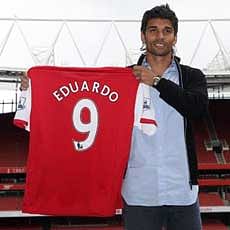 big flop for arsenal as he never turned out to be the no.9 that the highbury faithful expected him to be .The next player to wear the no. 9 was Spanish sensation José Antonio Reyes…the player was rather used as a left winger for his spell at arsenal and was quite unhappy by the ‘WEATHER ‘of London and went home to Spain with a swap deal to Madrid as Julio ‘THE BEAST’ Baptista came to arsenal..Baptista’s stay at arsenal was marred with inconsistency …scoring four goal at anfield in a game…but his one year loan deal didn’t persuade wenger to sign him on a permanent deal. The next player to wear an arsenal no.9 jersey was Eduardo’dudu’ da Silva…the brazil born Croatian seemed the real deal and capable to fill the void left by the talisman Thierry Henry.He had a nice start to his career at emirates, where he struck a nice partnership with adebayor .It seemed that the no.9 curse was over for the gunners but then came an away game at st.andrews….an English lad named martin Taylor who seemed to have made a gentle tackle on the arsenal forward that seemed just a soft touch even for the liking of the TV broadcaster who failed to show it on replay because they thought it was unnecessary to show such a faint tackle time and time again . Eduardo made a meal of this whole incident and feint an injury and went to hospital just like that and stooped so low that he continued faking his injury for a whole year just for the sake of making the angel hearted Taylor a villain in people’s eye…But Eduardo finally got fruits for all his craftiness and never played like what he seemed to have before his fake injury and finally concluded his stay in England because he was hated by people all over for him ruining the career of martin Taylor .
