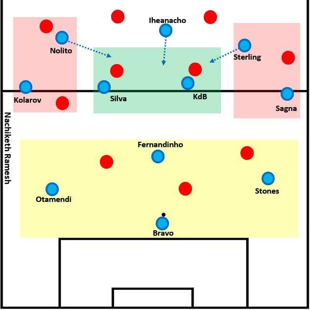 De Bruyne continued with #10 role. Of the three central midfielders of City, he was positioned higher than the other two. To fill up the space left behind by Silva’s deep movements, the Belgian was moving sideways towards the left wing – thus enabling either Iheanacho to drop down and Sterling to attack the #9 space or Sterling to move towards the half-space.