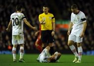 LIVERPOOL, ENGLAND – DECEMBER 01: Gaston Ramierez of Southampton lies injured during the Barclays Premier League match between Liverpool and Southampton at Anfield on December 1, 2012 in Liverpool, England.