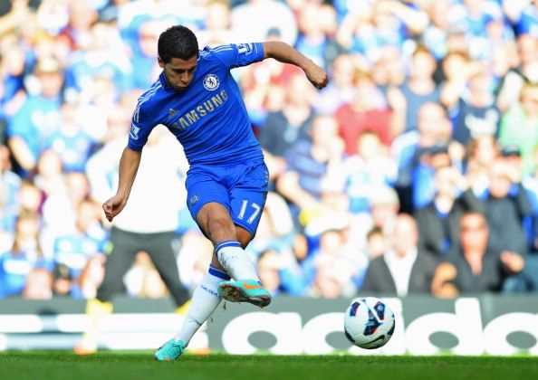 LONDON, ENGLAND – OCTOBER 06: Eden Hazard of Chelsea scores their third goal during the Barclays Premier League match between Chelsea and Norwich City at Stamford Bridge on October 6, 2012 in London, England.