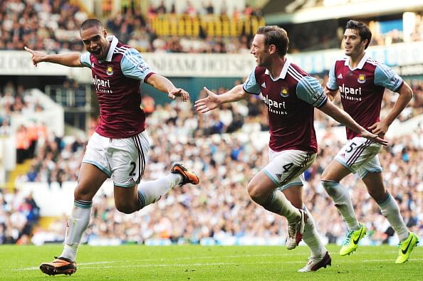 West Ham United’s New Zealand defender Winston Reid (L) celebrates scoring the opening goal during the English Premier League football match between Tottenham Hotspur and West Ham United at White Hart Lane in London on October 6, 2013.