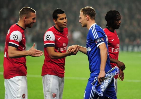 LONDON, ENGLAND – OCTOBER 24: Captain Benedikt Howedes of Schalke 04 shakes hands with Andre Santos and Lukas Podolski of Arsenal prior to the UEFA Champions League Group B match between Arsenal and FC Schalke at the Emirates Stadium.