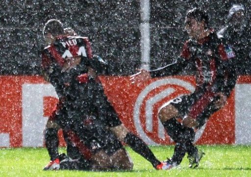 Nice celebrate in the pouring rain after Renato Civelli scores against Lyon in their French League Cup round of 16 October 31, at the Ray stadium in Nice. Nice scored three early goals to run out deserved 3-1 victors.