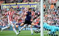 STOKE ON TRENT, ENGLAND – AUGUST 26: Oliver Giroud of Arsenal see’s his shot saved by Asmir Begovic of Stoke during the Barclays Premier League match between Stoke City and Arsenal at The Britannia Stadium on August 26, 2012 in Stoke on Trent, England. (Photo by Laurence Griffiths/Getty Images)