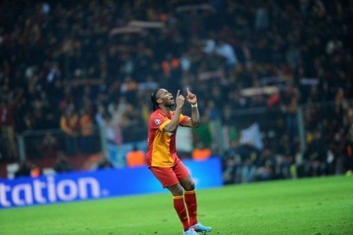 Galatasaray’s Ivorian forward Didier Drogba celebrates after his goal during the UEFA Champions League quarter-final second leg football match Galatasaray vs Real Madrid on April 9, 2013 at Ali Sami Yen stadium in Istanbul. Real Madrid withstood a second-half onslaught from Galatasaray to qualify for their third successive Champions League semi-final 5-3 on aggregate, despite losing 3-2.