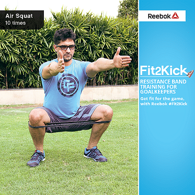 Step 2: Lower your body as if trying to sit down on a chair, and try and do a partial squat. This will cause the resistance band to stretch.