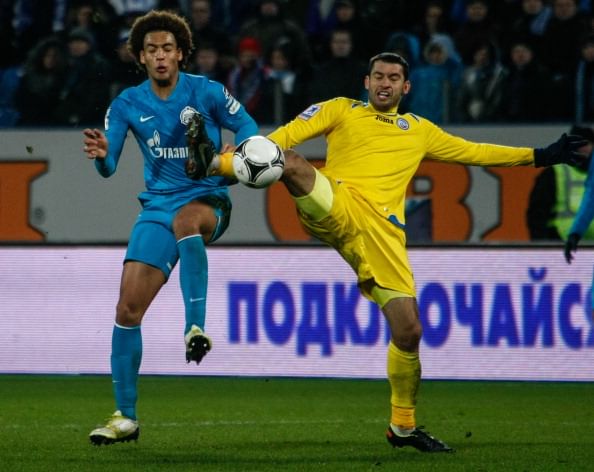 ST. PETERSBURG, RUSSIA – NOVEMBER 2: Axel Witsel of FC Zenit St. Petersburg (L) vies for the ball with Alexandru Gatcan of FC Rostov (R) during the Russian Football League Championship match between FC Zenit St. Petersburg and FC Rostov at the Petrovsky Stadium on November 2, 2012 in St. Petersburg, Russia.