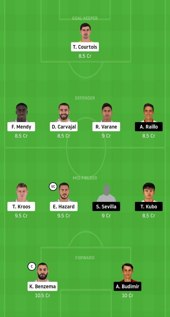 Fantasy Suggestion #1: Thibaut Courtois; Ferland Mendy, Antonio Raillo, Raphael Varane, Dani Carvajal; Toni Kroos, Eden Hazard, Salva Sevilla, Takefusa Kubo; Karim Benzema, Ante Budimir