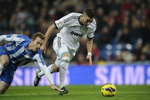 Real Madrid’s French forward Karim Benzema (R ) vies with Real Sociedad’s midfielder David Zurutuza during the Spanish league football match Real Madrid vs Real Sociedad at the Santiago Bernabeu stadium in Madrid on January 6, 2013. Madrid won 4-3.