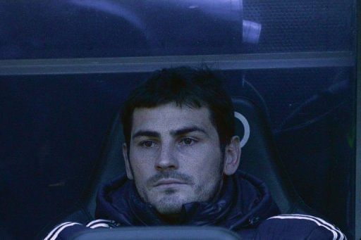 Real Madrid’s goalkeeper and captain Iker Casillas sits on the bench prior to the Spanish league football match Real Madrid vs Real Sociedad at the Santiago Bernabeu stadium in Madrid on January 6, 2013. Madrid won 4-3.