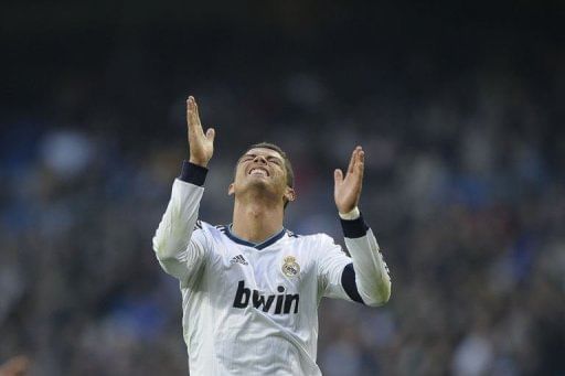 Real Madrid’s Portuguese forward Cristiano Ronaldo reacts during the Spanish league football match Real Madrid vs Real Sociedad at the Santiago Bernabeu stadium in Madrid on January 6, 2013. Madrid won 4-3.