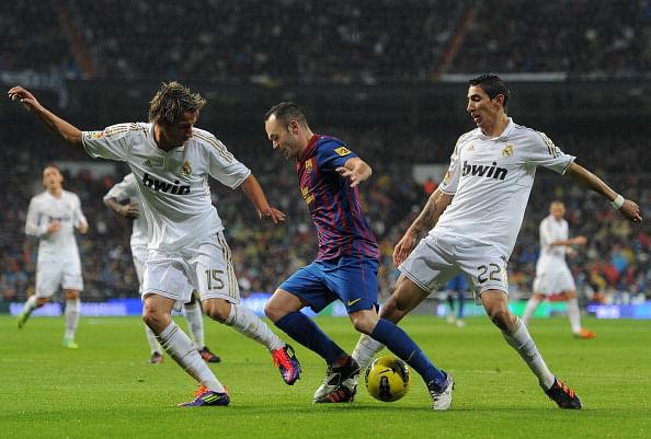 Fabio Coentrao (L) and Angel Di Maria of Real Madrid duel for the ball with Andres Iniesta of Barcelona
