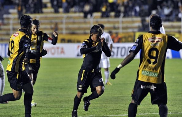 Nelvin Soliz (C) of Bolivia’s The Strongest celebrates with teammates after scoring against Brazil’s Sao Paulo, during their Libertadores Cup match in La Paz, Bolivia, on April 4, 2013.