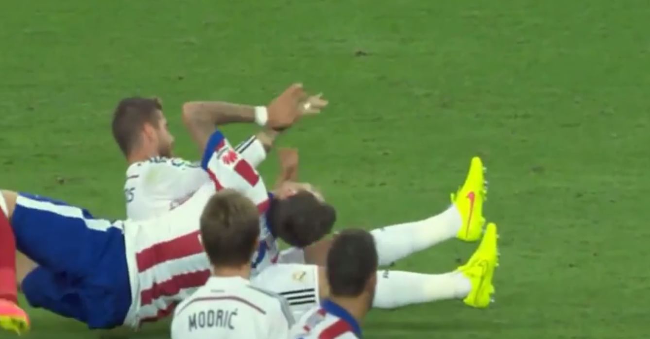The rivarly between Real Madrid and Atletico Madrid is somewhat known to be everyone, and the same was seen during the first leg of Tuesday’s Supercopa when Real Madrid vice captain appeared to have hit Atletico Madrid’s new striker Mario Mandzukic in the face with both of his hands.