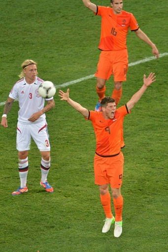 Dutch forward Klaas-Jan Huntelaar (R) gestures next to Danish defender Simon Kjær during their Euro 2012 football match.