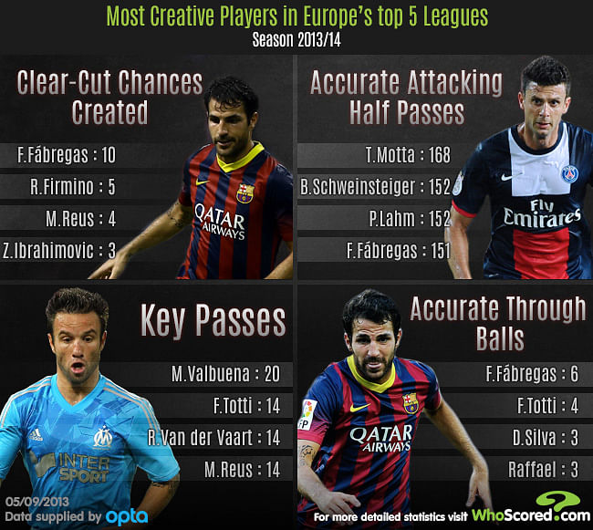 Cesc Fabregas has been proved to be the most creative player in Europe this season. He created 10 clear-cut chances and six accurate through balls so far this season for Barcelona. Thiago Motta leads the table of accurate attacking half passes, while Mathieu Valbuena leads the table of providing key passes.