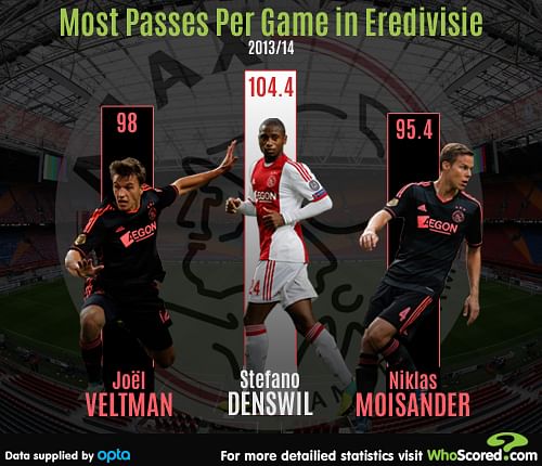 It’s also used to break down stubborn opposition. The majority of sides they face play in a compact 6-3-1 formation: the general idea being to make the pitch small, suffocate their creative players, and hit them on the break. To counter that, the centre-backs play a key role by constructing from the back. Stefano Denswil (104.4), Joël Veltman (98) and Moisander (95.4) are averaging the most passes per game in the division.