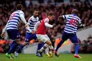 LONDON, ENGLAND – OCTOBER 27: Aaron Ramsey of Arsenal is closed down by Stephane Mbia (R), Ryan Nelsen (L) and Jose Bosingwa (2nd L)of QPR during the Barclays Premier League match between Arsenal and QPR at The Emirates Stadium on October 27, 2012 in London, England.