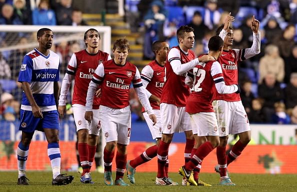 READING, ENGLAND – OCTOBER 30: Marouane Chamakh of Arsenal (R) celebrates after scoring their fifth goal during the Capital One Cup Fourth Round match between Reading and Arsenal at Madejski Stadium on October 30, 2012 in Reading, England.