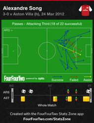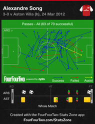 As one can see, Song’s passing in this game was quite average to say the least, especially for a player who plays for such a free flowing football team like Arsenal, completing only 74% of his passes. Now let’s compare Song’s passing with a league game from this season against Aston Villa at the Emirates Stadium.