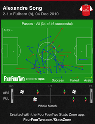 Along with his forward ventures, Song has improved his overall passing ability as well, with lofted through balls being a key feature of his game now which has led to many Arsenal game winners including games against Everton, and Liverpool to name a few. Using last season’s game against Fulham as an example once again, let’s look at Song’s passing in that particular game: