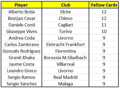 Getting booked is something footballers hate to the core, and Elche’s Alberto Botia has already received 12 yellow cards this season in just 21 matches. His feat is matched by Chievo’s Bostjan Cesar who has the same number of cards but in 20 matches.