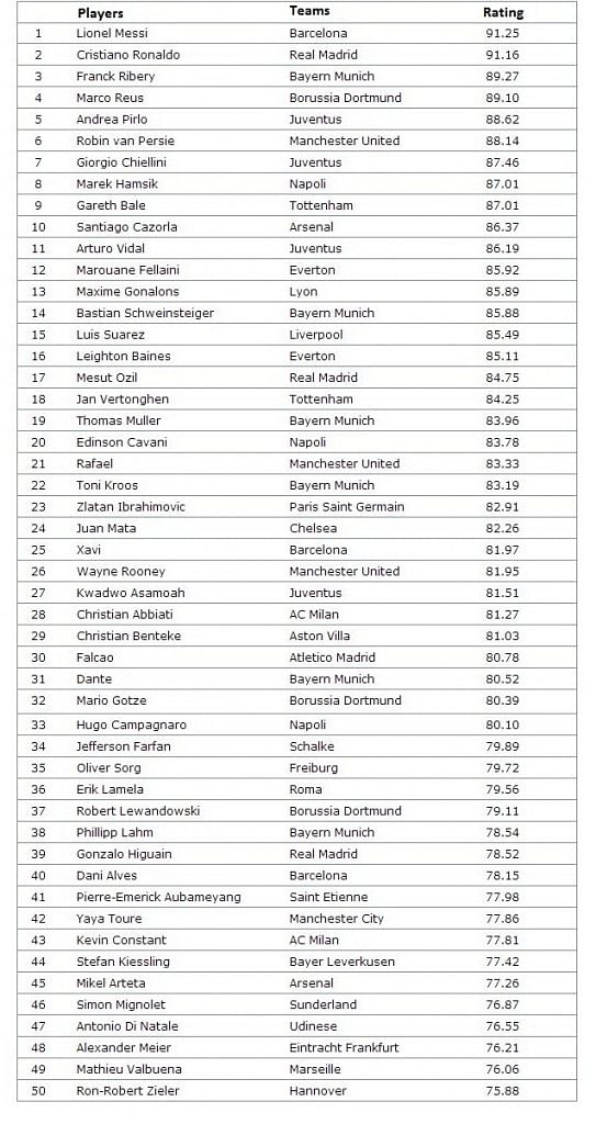 Lionel Messi of Barcelona has pipped Cristiano Ronaldo of Real Madrid (91.16) for the first spot with a rating of 91.25. Franck Ribery of Bayern Munich came in third with a rating of 89.27. Marco Reus of Borussia Dortmund is 4th at 89.10, while Andrea Pirlo of Juventus bagged 5th spot.