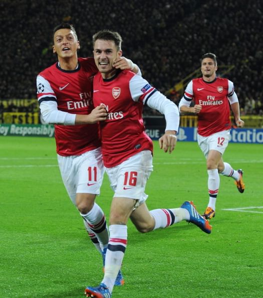 (R) Aaron Ramsey celebrates scoring Arsenal’s goal with (L) Mesut Ozil during the UEFA Champions League Group F match between Borussia Dortmund and Arsenal at Signal Iduna Park