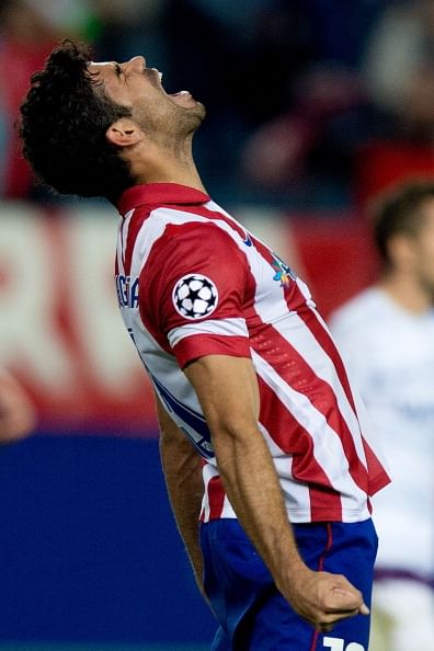Diego Costa celebrates scoring Atletico’s fourth goal during the UEFA Champions League group G between Atletico Madrid and FK Austria Wien