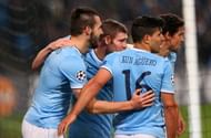Alvaro Negredo of Manchester City celebrates after scoring his team’s fifth goal to complete his hat-trick during the UEFA Champions League Group D match between Manchester City and CSKA Moscow