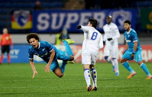 Zenit Saint-Petersburg’s Axel Witsel (L) vies with Porto’s Josue (C) during their UEFA Champions League group G football match