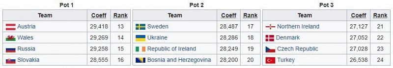 League B will also have 12 teams much like League A. They were the 12 highest ranked teams in Europe after the teams in League A at the time of seeding. The teams were again divided into 4 pots. The pots are shown below.