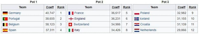 League A will consist of 12 teams which are the 12 highest ranked European Teams. The 12 teams will be divided into groups of 3. The teams in the 4 groups will play each other twice, once in their home and once away. The teams were seeded in 4 pots as per their rankings. The pots are as shown in the image.