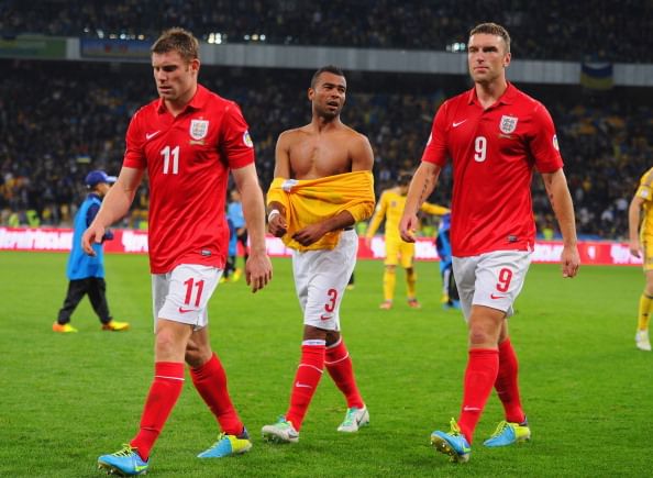 James Milner, Ashley Cole and Rickie Lambert look on after the FIFA 2014 World Cup qualifier at the Olympic Stadium in Kiev, Ukraine. (Getty Images)