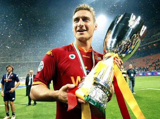 AS Roma’s forward and captain Francesco Totti holds the trophy, on August 19, 2007 after winning the ltalian Super Cup over Inter Milan 1-0 at Maezza Stadium in Milan.
