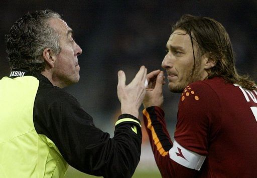 AS Roma captain Francesco Totti (R) argues with the side referee during a Serie A match against Inter Milan at Rome Olympic stadium on March 7, 2004.