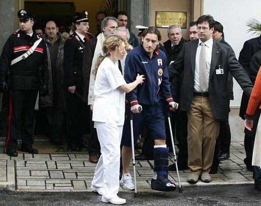 AS Roma captain Francesco Totti (C) leaves the Villa Stuart hospital in Rome on February 22, 2006.
