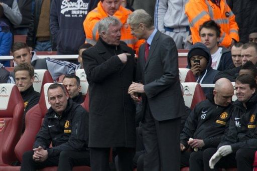 Arsenal manager Arsene Wenger (R) and Manchester United boss Alex Ferguson before kick-off on April 28, 2013. Wenger revealed that Robin van Persie had taken the opportunity to catch up with some of his former team-mates, but said he was pleased by his side’s efforts to prevent him from enjoying his return to his old stomping ground.